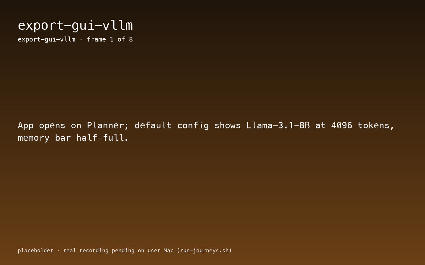 Journey ID: export-gui-vllmStatus: Implemented (placeholder artefacts — real recording pending on user Mac) Last Updated: 2026-04-19