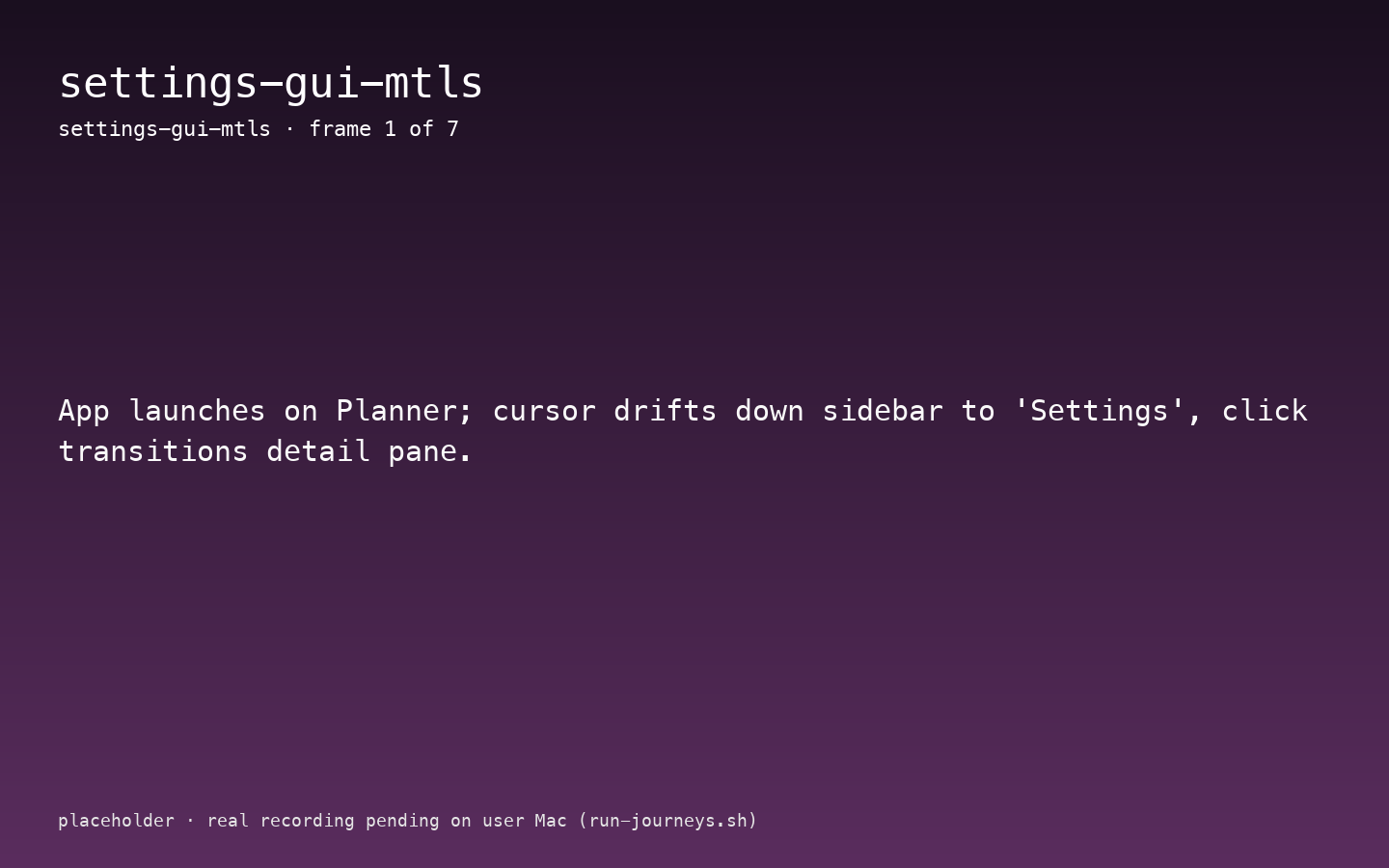 Journey ID: settings-gui-mtlsStatus: Implemented (placeholder artefacts — real recording pending on user Mac) Last Updated: 2026-04-19